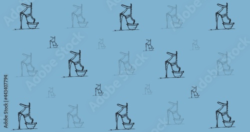 Composition of drawings of shoes repeated on blue background