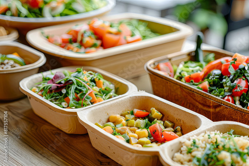 Composition of eco-friendly and compostable food containers with freshly prepared slow food dishes, highlighting healthy ingredients and curated presentations