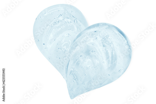 Composition of smears and drops or drops of a transparent blue gel, serum. On an empty transparent background.