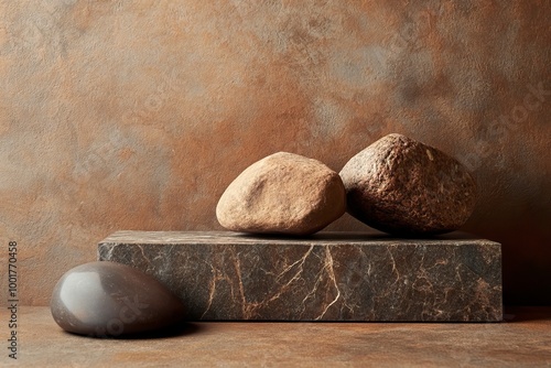 composition of stones for the podium. natural brown stones for the podium background with texture for cosmetics, perfumery, medicine, jewelry with generative ai