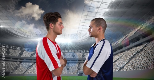 two people, young adult, man, male, black, caucasian, people, composition, football player, crossing, arm, sport, stadium, competition, concept, montage, recreation, exercise, activity, fitness, football, athlete, game, active, soccer, training, championship, ball, match, goal, athletic, leisure, play, action, player, digitally, generated, image