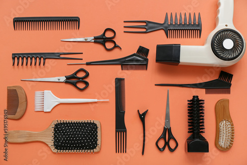 accessory, composition, hair care, red, background, barber, beauty, brush, care, colours, comb, concept, cut, different, dryer, dye, equipment, fashion, flat, hair, haircut, coiffure, hairdresser, coiffure, coiffure, instrument, job, lay, many, nobody, object, orange, pattern, profession, professional, salon, scissors, service, set, style, styling, hairdresser, supply, texture, tool, top, treatment, trend, view