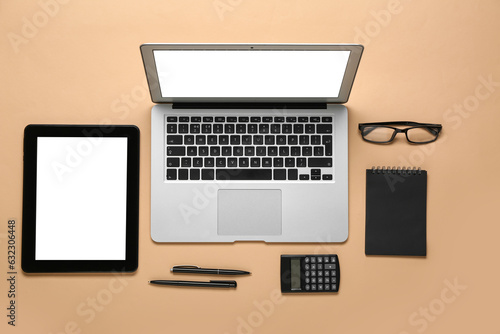beige, calculating machine, composition, eyeglass, laptop, background, business, career, colours, computer, device, digital, education, flat, freelance, freelancer, contraption, information, cyberspace, job, lay, management, marketing, media, modern, network, nobody, notebook, object, office, online, pen, profession, site, stationery, student, study, table, tablet, technology, top, view, web, work, men at work, workplace, workspace