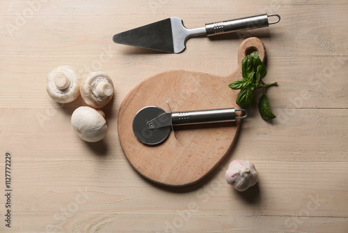 composition, cutter, mushroom, pizza, spatula, stainless, steel, wooden, background, basil, blade, board, chef, circle, cook, cookware, culinary, cut, cutting, dinner, disc, crockery, equipment, flat, food, household, italian, item, kitchen, kitchen utensile, knife, lay, metal, new, nobody, object, rotate, set, sharp, slice, table, tool, top, utensil, utensil, view, wheel