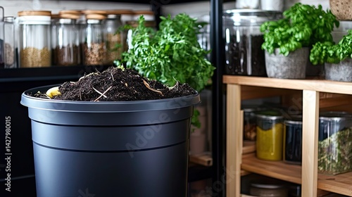 Composting bin beside a minimal pantry of glass and ceramic containers
