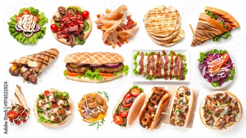 Comprehensive set of fast foods, from crispy bacon to shawarma, elegantly displayed on a white canvas