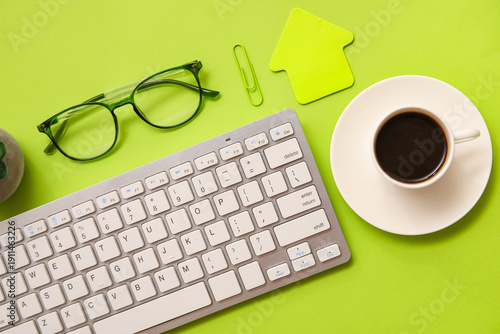 Computer keyboard with eyeglasses and cup of coffee on green background