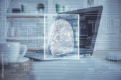 Computer on desktop in office with finger print drawing. Double exposure. Concept of business data security.