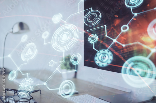Computer on desktop with social network hologram. Multi exposure. Concept of international people connections.