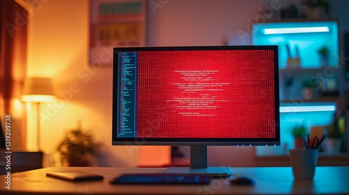 Computer screen showing red ransomware warning message in home office setting, highlighting cybersecurity threats and digital safety concerns