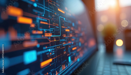Computer screen shows tech interface with data streams. Blue, orange lines connect elements in cyberspace. Digital network visualization with abstract glowing scheme displays innovative engineering