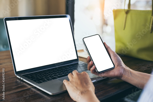 computer,cell phone mockup image.hand woman work using laptop texting mobile.blank screen with white background for advertising,contact business search information on desk in cafe.marketing,design