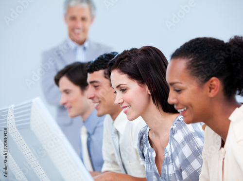 company, business, happiness, positive, manager, computer, attractive, photogenic, businessman, executive, male, man, men at work, adult, businesswoman, female, woman, self-assured, assertive, caucasian, asian, diversity, multi-ethnic, corporate, worldwide, globalisation, commerce, office, happy, smiling, cheerful, background, isolated, check, checking, employee, mature