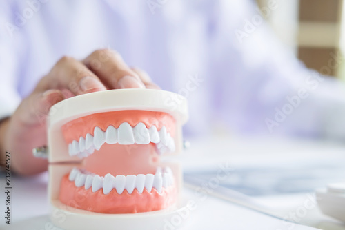 Concentrated dentist sitting at table with jaw samples tooth model in dental office professional dental clinic