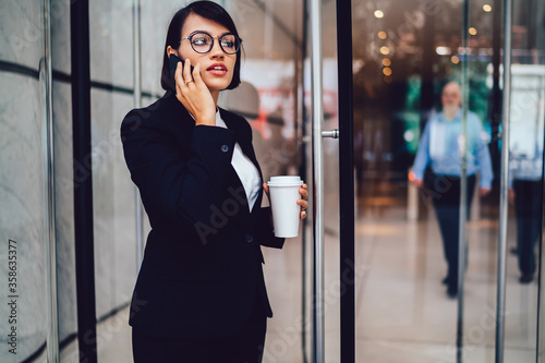 Concentrated financial manager in elegant wear talking on smartphone near business center, serious woman trader in eyeglasses having phone conversation about startup project during coffee time
