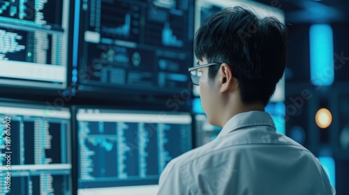 Concentrated man in a high tech environment examines intricate charts and system workflows displayed on numerous monitors reflecting advanced and data analysis for business strategy