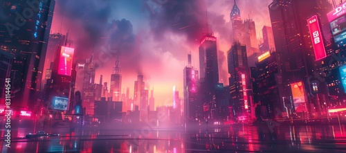 Concept art of a sci-fi cityscape with tall buildings illuminated by neon lights