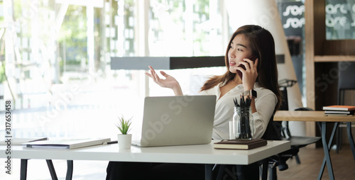 Concept business woman working and people happy businesswoman or creative female office worker with computers writing to notebook with documents and laptop.