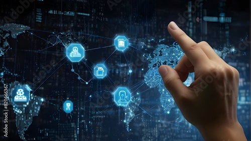 Concept of internet network connectivity and digital technologies. Fingers tapping on a virtual screen featuring data sharing, digital revolution, and futuristic technological backdrop