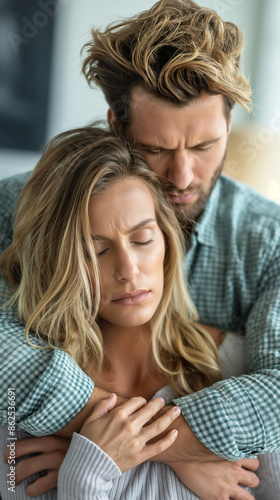 Concept of Pain, Frustration, Overwhelm, and Migraine: Woman Suffering from Pain, Man Embracing and Comforting Her.