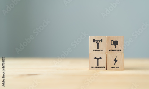 Concept of SWOT analysis and strategic planning technique. Strengths, weaknesses, threats and opportunities of company. SWOT symbols on wooden cubes with beautiful grey background and copy space.