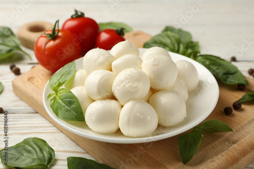 Concept of tasty eating with bowl of mozzarella cheese on white wooden background
