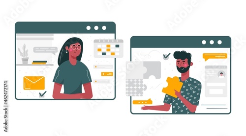 Concept of videoconference, chatting, online meeting workspace. Design template with business people taking, marketing, leaflet, advertising, brochure, modern style vector