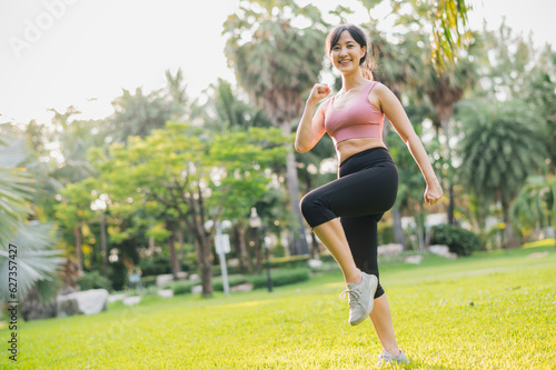 concept of wellness and well-being fit 30s Asian woman wearing pink sportswear exercising in public park at sunset. healthy outdoor lifestyle, wellness and well-being.