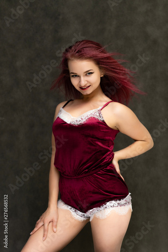 Concept portrait of a knee-high pretty sexy girl with purple hair in beautiful red lingerie on a gray background. She smiles, happy with life, happy. Hair flying, front view. Made in a studio.