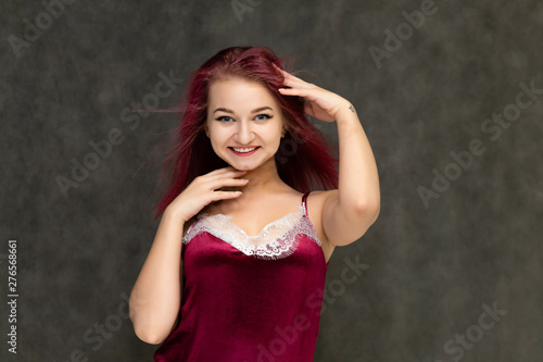 Concept portrait of a pretty sexy girl with purple hair in beautiful red lingerie on a gray background. She smiles, happy with life, happy. Hair flying, front view. Made in a studio.