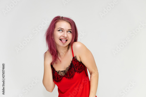 Concept portrait of a pretty sexy girl with purple hair in beautiful red lingerie on a white background. She smiles, happy with life, happy. Hair flying, front view. Made in a studio.