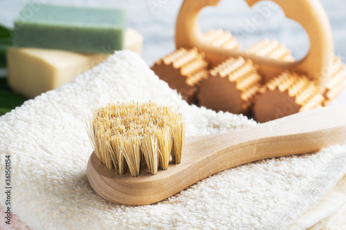 Concept SPA and Wellness. Massage brush, cosmetic oils and soap. Light background.