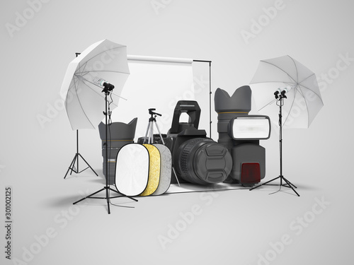 Concept studio equipment softboxes photo umbrella reflectors 3d rendering on gray background with shadow