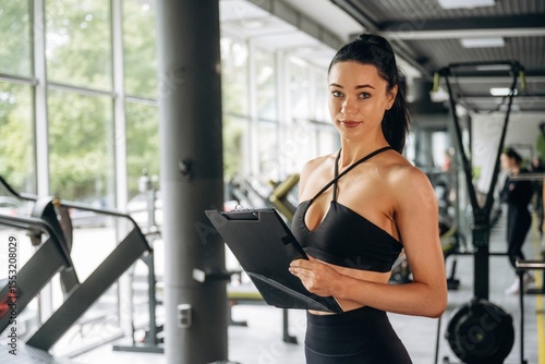 woman, trainer, standing, gym, holding, business, conception, notepad, datum, service, occupation, work, job, black, clothes, wear, session, information, strong, strength, fit, beautiful, human, gorgeous, female, sport, pretty, arm, young, hand, body, motivation, adult, background, wellness, well-being, indoor, modern, heavy, metal, health, achievement, active, interior, 1, person, caucasian, european