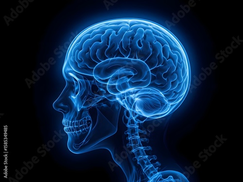 Conceptual brain illustration highlighting the human head, skull, and spinal cord in a blue x ray anatomical view.