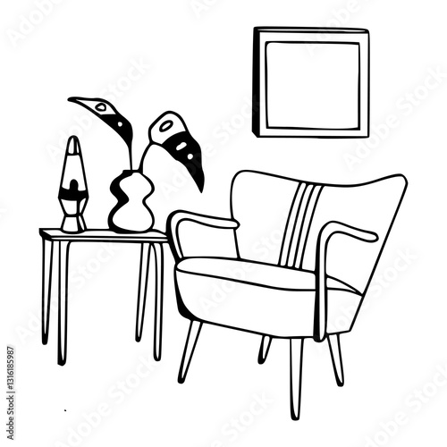 armchair, furniture, retro, modern, living room, decor, home, plant, concept, chair, style, elegant, room, comfort, interior, design, drawing, art, clip art, pen, ink, cartoon, outline, silhouette, thing, line art, doodle, vignetting, scribble, vector, illustration, graphic, black-and-white, icon, hand-drawn, digital artwork, minimalist, graphic design, design element, isolated