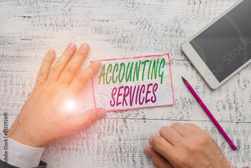 Conceptual hand writing showing Accounting Services. Concept meaning analyze financial transactions of a business or a demonstrating Hand hold note paper near writing equipment and smartphone
