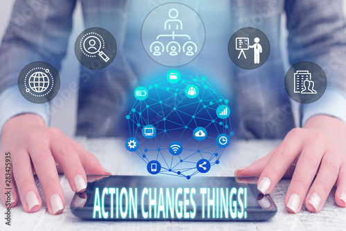 Conceptual hand writing showing Action Changes Things. Concept meaning start doing something against problem resolve or achieve it Female human wear formal work suit presenting smart device