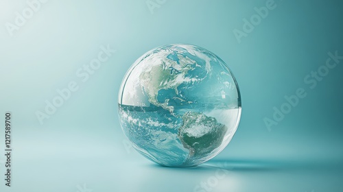 Conceptual illustration Glass globe of Planet Earth on a cool blue background, minimalist aesthetic