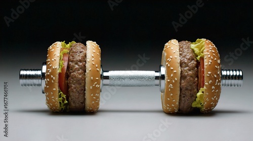 Conceptual Image Contrasting Fast Food and Fitness a Dumbbell Adorned with Juicy Hamburgers as Weight Plates on a Neutral Background