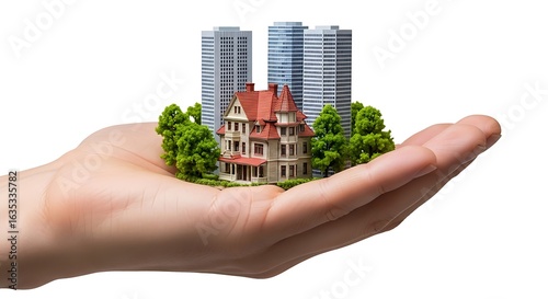 house, hand, miniature, skyscraper, city, urban, development, real estate, investment, property, building, architecture, modern, traditional, sustainable, future, concept, studio shot, construction, residential, commercial, home, apartment, palm, tree, growth