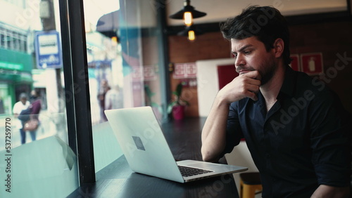 Concerned pensive young entrepreneur man in front of laptop computer seated by window at cafe co working remote workplace