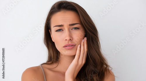 Concerned woman touching cheek with troubled expression, acne and skincare problem acne treatment, skincare problem, young woman face, beauty issues, skin blemishes, cosmetic care,