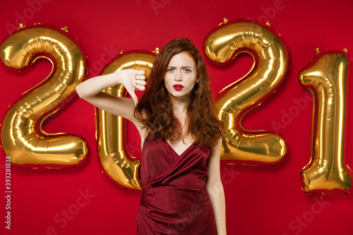 Concerned young redhead woman in elegant dress showing thumb down isolated on red color background, golden numbers air balloons studio portrait. Happy New Year 2021 celebration holiday party concept.