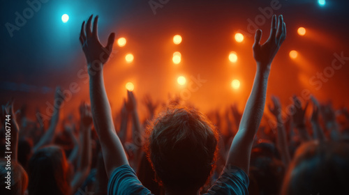 Concert Audience Enthusiasm: A sea of upraised arms and faces lights up in an electrifying moment. Capture the energy, passion, and collective euphoria of the crowd in front of the stage.