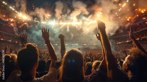 concert, crowd, stadium, hand, energy, excitement, light, smoke, music, performance, stage, audience, silhouette, celebration, festival, night, dark, joy, passion, enthusiasm, event, gathering, spectacle, show, live, entertainment, party, atmosphere, vibe, bright, brightly, flash, flashing, flashy