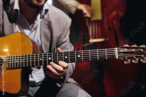 Concert view of acoustic electric guitar player with vocalist and rock band performing in a club, male musician guitarist on stage with audience in a crowded concert club hall arena, hands on guitar