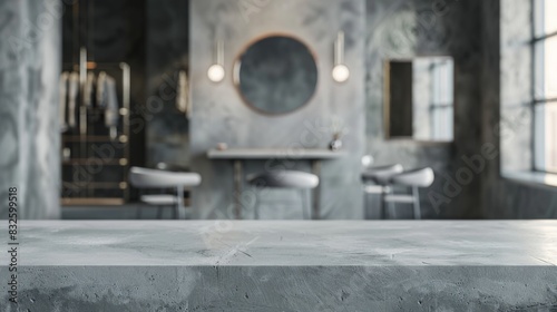 Concrete countertop against blurred beauty salon background for product. Mockup of an empty tabletop in a studio with mirrors and chairs. Stone platform for the presentation of cosmetics.