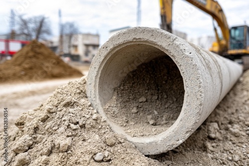 Concrete pipe on construction site, excavator in background, piles of dirt and sand.