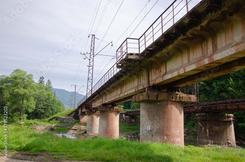 Concrete river bridge. Reinforced concrete bridge construction. Mountain bridge nature background.